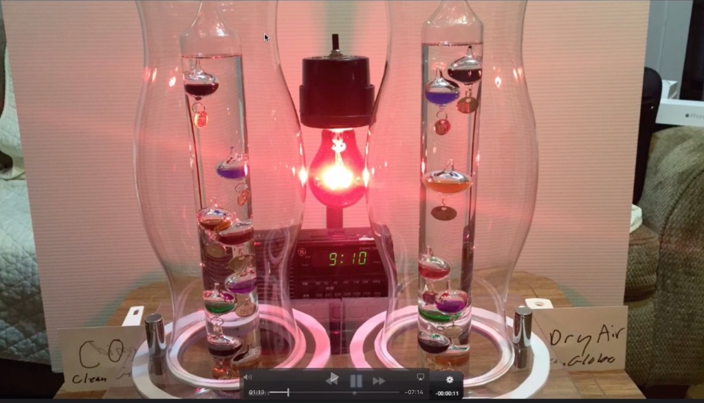 This anisotropicplus video is about an attempt to visually demonstrate the greenhouse gas effect for carbon dioxide, water vapor and water vapor plus carbon dioxide compared to dry air. We found that the Galileo thermometers we used were not accurate or precise enough to show a convincing difference in absorption of infrared radiation.