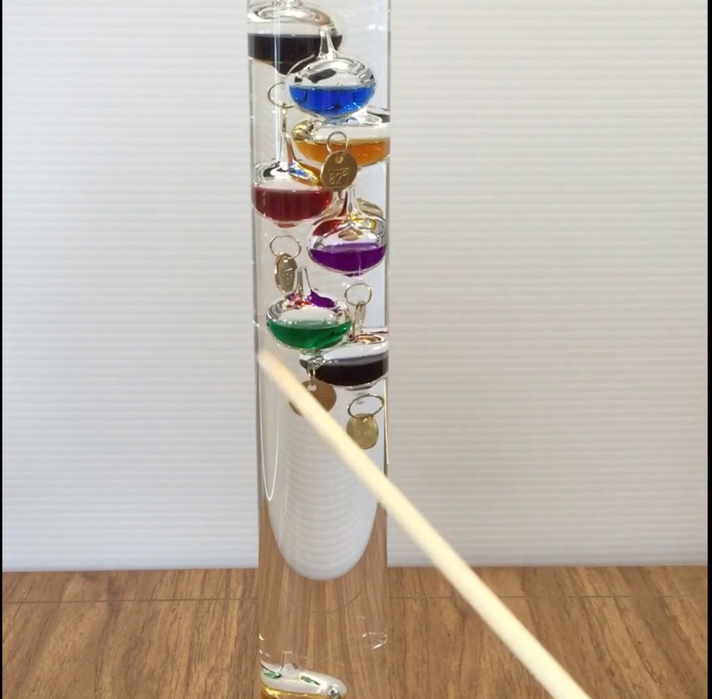 This anisotropicplus video demonstrates what a Galileo thermometer is and includes a time lapse video that shows the calibrated floats dropping as the density of the liquid decreases with increasing temperature.