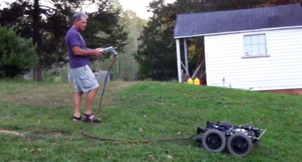 This anisotropicplus video shows how a simple and very inexpensive robot with four wheel drive and tank steering can be made using scrap electric wheelchair parts.