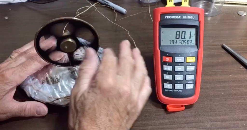 This anisotropicplus video demonstration shows how you can preferentially heat one side or the other of a small heat pump by manually spinning the flywheel in different directions of rotation. There is a surprising result in this experiment. For some reason spinning it in clockwise heated one side, but the opposite side did not cool down. The same effect, but on the opposite side occurred when spinning it counterclockwise.