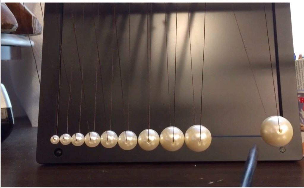 This anisotropicplus video shows a modified newton’s cradle with small spheres on one end and large ones on the other demonstrating how conservation of momentum converts a slow moving large sphere into a faster moving small sphere. This video was extracted from another video: