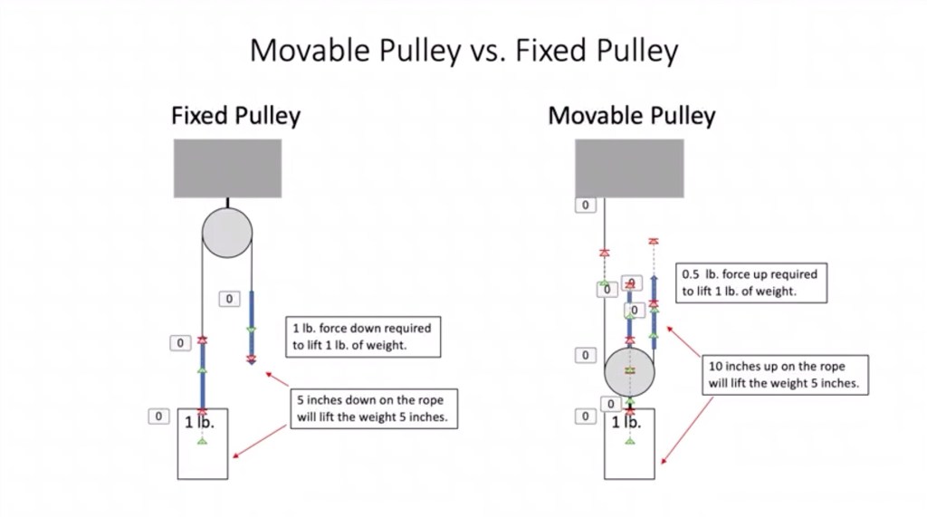 This anisotropicplus video is a simple, but detailed description of the difference in mechanical advantage when lifting an object with a movable pulley compared to a fixed pulley.