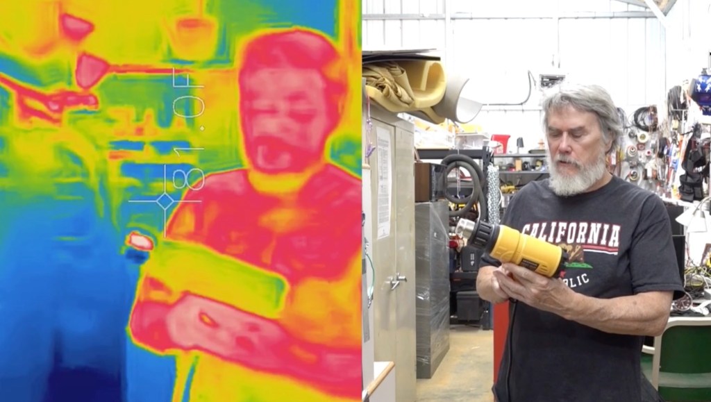 This anisotropicplus video explores whether infrared from a hot air gun can be seen by infrared thermal imaging and whether it can propagate through a 90 degree aluminum dryer vent elbow covered with black polyethylene. Usually the infrared emitted from a hot air blower is ignored and this video supports that it could be a meaningful component of energy transmitted to a target irrespective of the hot air. The hot air itself is not a source of infrared radiation so it has to come from the heating elements in the blower.