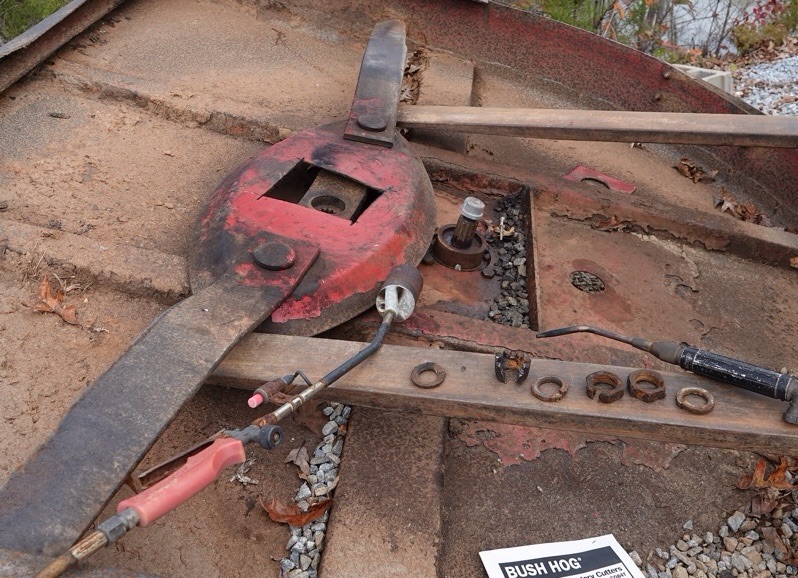 I hit a stump with my Bush Hog and it began shaking violently. The blades were not obviously bent or damaged, but there was a dent on the stump Jumper. I decided to remove the stump jumper which can be a major challenge. I created this anisotropicplus video after I was able to remove it to share the technique I used along with a couple of mistakes. This is a SQ172 Bush Hog. The blade nut size requires a 1 11/16 ” per the manual and I found that to be what I needed. I found that a 36mm socket fit the castle nut on the gearbox output shaft. I have now replaced the gearbox and bent the framework back into shape and the Bush Hog works fine without any vibration. The new gearbox, new blades and blade nuts cost $742.32 from a local tractor dealer. I also purchased some anti seize which I put on everything and I had to purchase the unusual sockets from Amazon.
